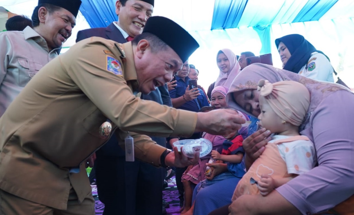 Gubernur Jambi Al Haris menyapa balita saat Pencanangan PIN Polio dan Launching Inovasi Stunting Pemerintah Kabupaten Sarolangun serta Pemberian Makanan Tambahan untuk Anak Stunting, di SDN 03/VII Pasar Sarolangun, Kabupaten Sarolangun, Selasa (23/07/2024)
