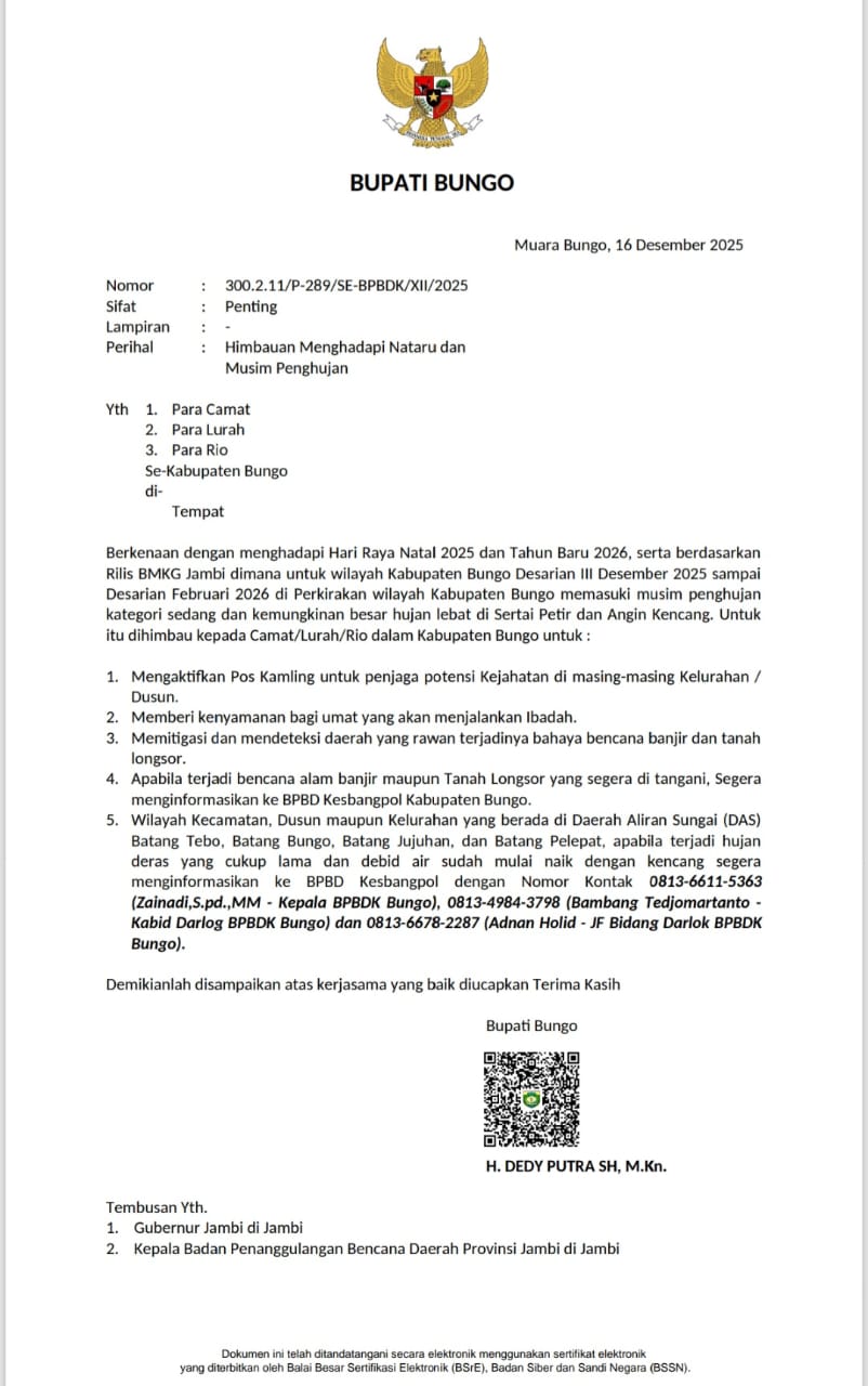 GANYANG NEWS, BUNGO – Bupati Bungo, H. Dedy Putra, SH., M.Kn., mengeluarkan Surat Imbauan Nomor 300.2.11/P-289/SE-BPBDK/XII/2025 tertanggal 16 Desember 2025 kepada seluruh Camat, Lurah, dan Rio se-Kabupaten Bungo terkait kesiapsiagaan menghadapi Hari Raya Natal 2025, Tahun Baru 2026, serta musim penghujan.