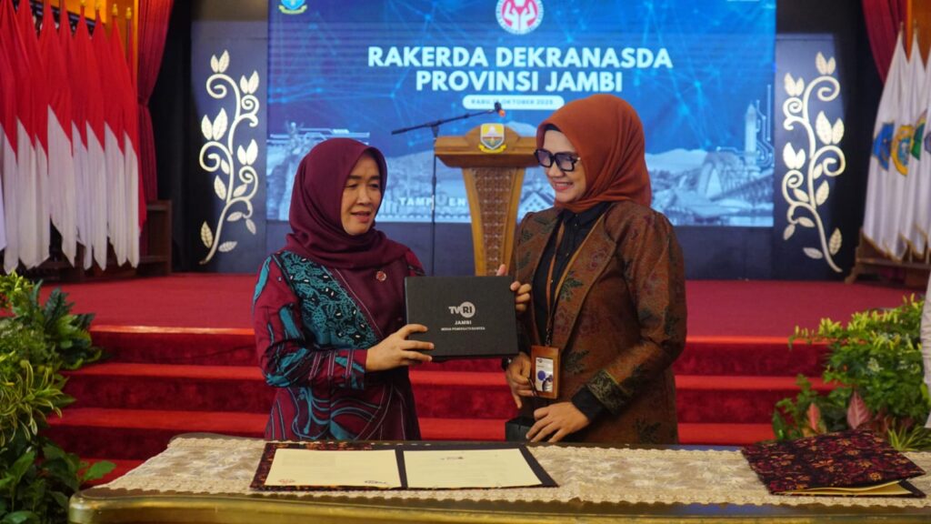 GANYANG NEWS, JAMBI – Jambi (Diskominfo Provinsi Jambi) – Ketua Dewan Kerajinan Nasional Daerah (Dekranasda) Provinsi Jambi, Hj. Hesnidar Haris, SE (Hesti Haris), menjalin kerja sama strategis dengan Televisi Republik Indonesia (TVRI) Stasiun Jambi melalui penandatanganan Nota Kesepakatan Program Penyiaran Pembinaan dan Pengembangan Perajin Kriya di Provinsi Jambi.Penandatanganan kerja sama ini berlangsung dalam Rapat Kerja Daerah (Rakerda) Dekranasda Provinsi Jambi yang digelar di Auditorium Rumah Dinas Gubernur Jambi, Rabu (15/10/2025).