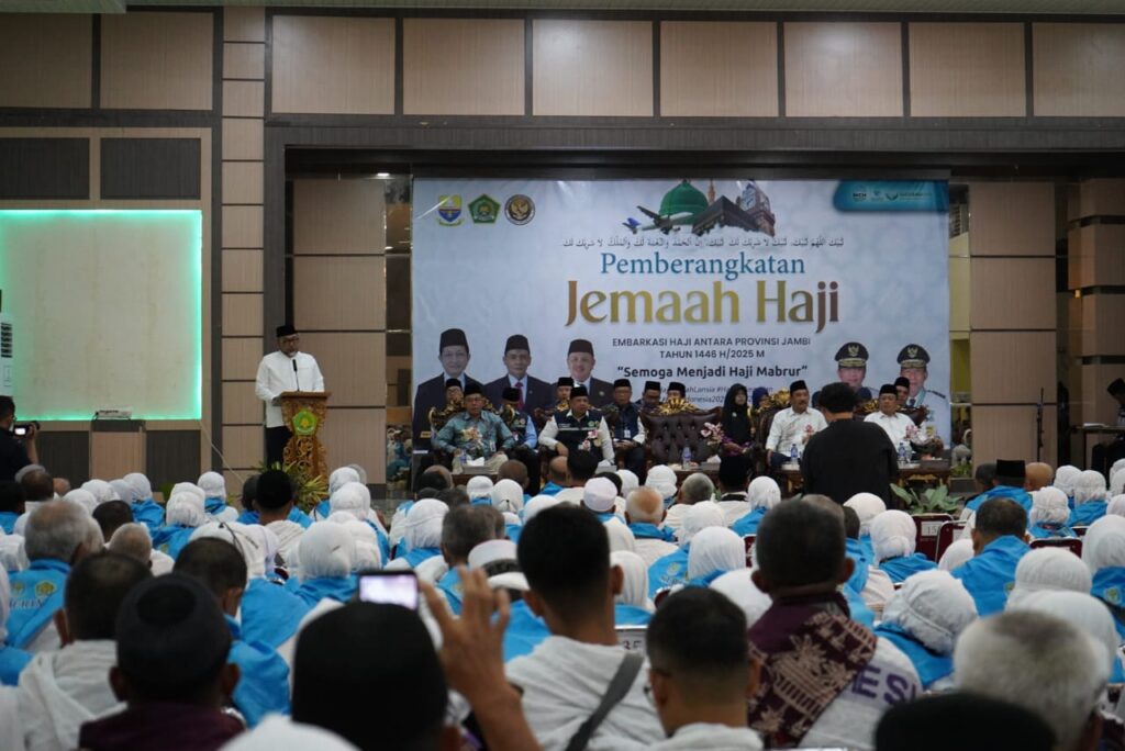 Ganyang News- Jambi (Diskominfo Provinsi Jambi) – Sekretaris Daerah (Sekda) Provinsi Jambi Dr. H. Sudirman, SH, MH berpesan kepada Jemaah Calon Haji (JCH) untuk dapat mengkondisikan diri meningkatkan kesabaran dan menata niat secara tulus guna mendapatkan ridho dari Allah SWT, berdisiplin, mengatur waktu sebaik-baiknya, berupaya menjaga kesehatan dengan mengatur pola makan, minum dan istirahat yang cukup. Pesan tersebut disampaikannya saat Pelepasan Jemaah Calon Haji (JCH) yang tergabung dalam Kloter 18 BTH berjumlah 445 (JCH) dari Kabupaten Kerinci 291, Kabupaten Merangin 147, dan petugas haji 7 orang, Provinsi Jambi Tahun 1446 Hijriah/2025 Masehi, bertempat di Asrama Haji Kota Baru, Kota Jambi, Selasa (20/05/2025) subuh.