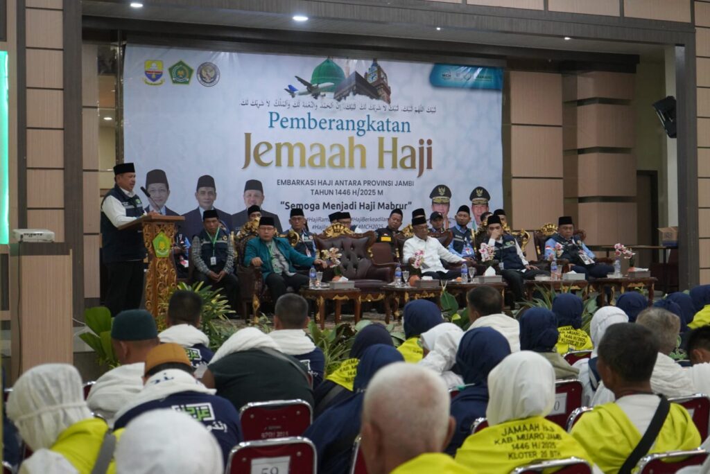 Ganyang News- Jambi (Diskominfo Provinsi Jambi) – Gubernur Jambi yang diwakili oleh Asisten III Sekda Provinsi Jambi Bidang Administrasi Umum Jangcik Mohza, S.Pd, M.Si melepas secara resmi keberangkatan Jemaah Calon Haji (JCH) yang tergabung dalam Kloter 20 BTH berjumlah 444 (JCH) dari Kabupaten Muaro Jambi 146, Kabupaten Tanjung Jabung Barat 91, Merangin 197, Kota Jambi 1 dan petugas haji 9 orang, Provinsi Jambi Tahun 1446 Hijriah/2025 Masehi, bertempat di Asrama Haji Kota Baru, Kota Jambi, Kamis (21/05/2025) pagi.
