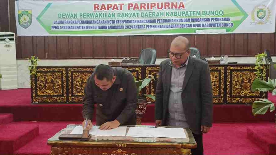GANYANG NEWS, BUNGO – Pemerintah Kabupaten Bungo bersama DPRD menandatangani nota kesepakatan perubahan kebijakan umum APBD (KUA) dan perubahan prioritas plafon anggaran sementara (PPAS) tahun anggaran 2024.