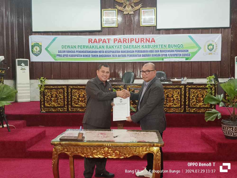Penandatanganan nota kesepakatan itu di lakukan oleh Bupati Bungo H.Mashuri.S.P.ME dan wakil ketua II DPRD Bungo Martunis,A.Md dan di saksikan sebanyak 24 anggota DPRD dari 35 anggota, unsur Forkompinda, Sekda, Staf Ahli Bupati, Asisten, Kepala OPD, para Kabag, Camat, dan lurah yang berlangsung di Ruang Paripurna DPRD Kabupaten Bungo, Senin Pagi (29/07/2024).