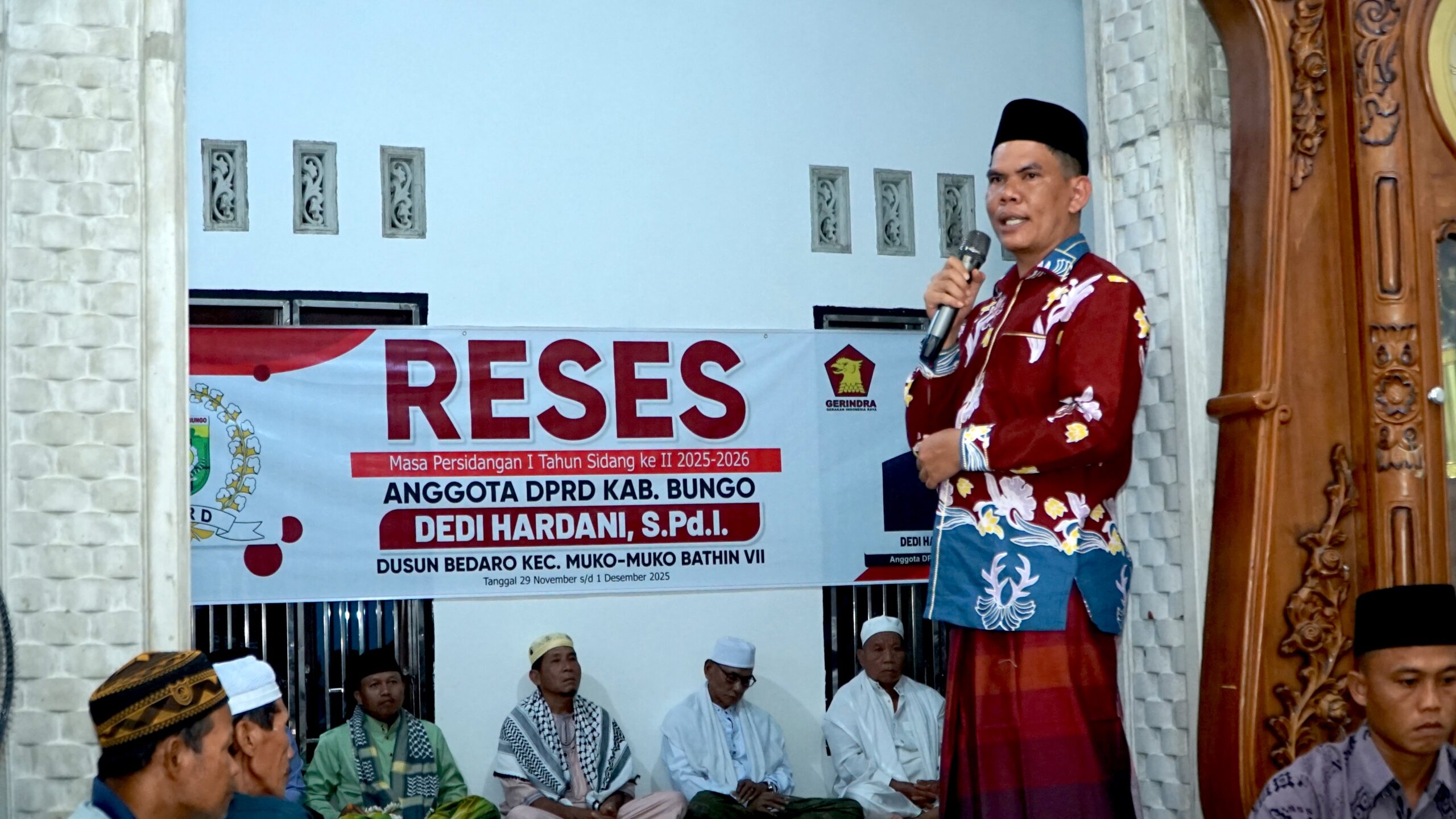 GANYANGNEWS, BUNGO – Anggota DPRD Bungo yang juga Ketua Komisi I DPRD Bungo, Dedi Hardani (DH) melakukan reses di akhir tahun ini. Reses ini dilakukan untuk menyerap aspirasi warga untuk rencana pembangunan di tahun anggaran 2027 mendatang. Seratusan lebih warga menghadiri acara yang digelar di kediaman DH, Dusun Bedaro Kecamatan Muko-muko Bathin VII.