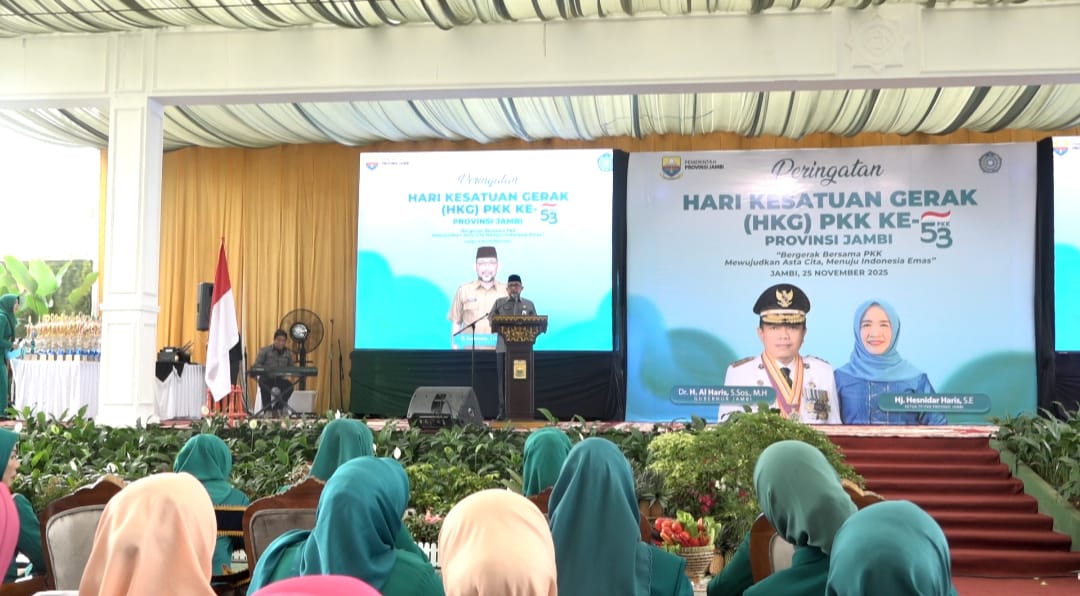 GANYANG NEWS, JAMBI – Sekretaris Daerah Provinsi Jambi, Dr. H. Sudirman, SH, MH, resmi mengukuhkan Hj. Hesti Haris sebagai Bunda Literasi Provinsi Jambi berdasarkan Keputusan Gubernur Jambi Nomor 1049/KEP.GUB/DPAD/2025 yang ditetapkan pada 17 November 2025. Pengukuhan tersebut dilaksanakan bersamaan dengan puncak peringatan Hari Kesatuan Gerak (HKG) PKK ke-53 Provinsi Jambi yang berlangsung di Ev Garden Kota Jambi, Selasa (25/11/2025) pagi.