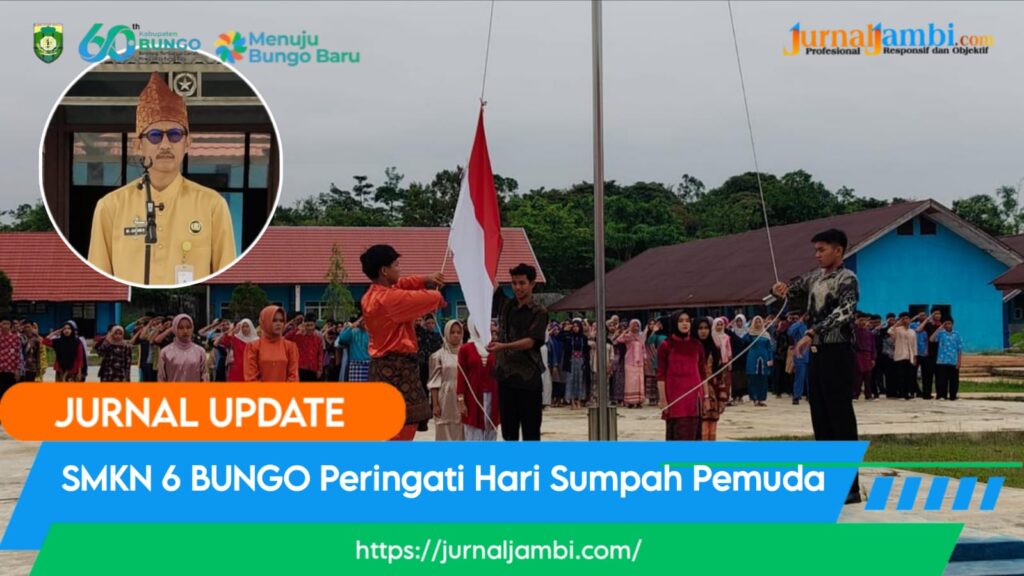 GANYANGNEWS, BUNGO – Dalam suasana penuh semangat dan kesederhanaan, seluruh guru, staf Tata Usaha, serta siswa-siswi SMKN 6 Bungo melaksanakan upacara memperingati Hari Sumpah Pemuda ke-97 di lapangan sekolah, Selasa (28/10/25).Upacara berlangsung khidmat dengan mengusung tema nasional “Bersatu, Bangkit, dan Tumbuh untuk Indonesia Maju.”